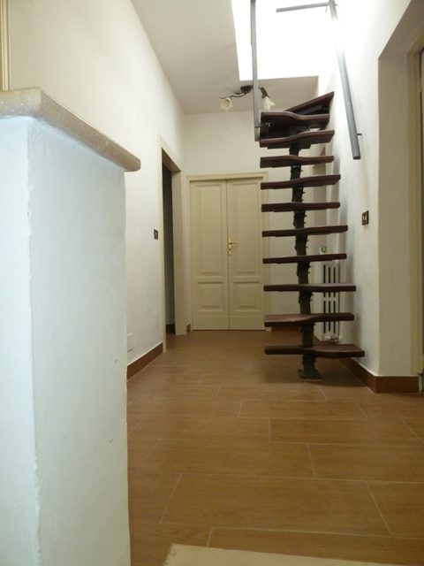 Arrivo al disimpegno superiore con vista della scala in ferro e legno per l'accesso al balcone superiore